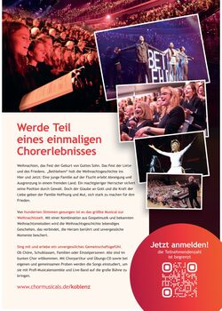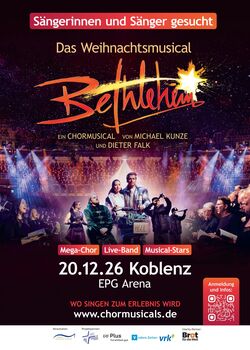 Das Ziel: Chormusical 'Bethlehem' mit großem Projektchor, am 20.12. in der EPG-Arena Koblenz. Frühbucherrabatt für Anmeldungen bis zum 30. April nutzen: 29,00 Euro statt regulär 39,00 Euro.